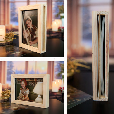 Álbum de 25x25cm con cubierta rígida sobreimpresa + caja con marco de madera y tapa con impresión personalizada. Incluye 12 páginas, máximo 20 fotografías. Página extra: +9€.